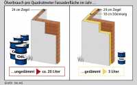 Die durchschnittliche Energiekennzahl (EKZ) für Altbau-ten liegt bei ca. 250 kWh/m2a (Kilowattstunden pro Qua-dratmeter und Jahr). Das entspricht 25 Liter Öl oder 25 m3 Gas pro Quadratmeter Wohnfläche im Jahr. Ein ver-gleichbarer, optimal gedämmter Altbau hat eine EKZ von ca. 80 kWh/m2a, das entspricht dann nur noch 8 Liter Öl bzw. 8 m3 Gas pro Quadratmeter Wohnfläche im Jahr. Das heißt, der Energieverbrauch läßt sich auf ein Drittel reduzieren. In Verbindung mit der Erneuerung der Fenster und der Modernisierung der Heizungsanlage werden damit energetische Einsparpotentiale von bis zu 75 Prozent realisiert. Rund ein Viertel dieses Einsparpotentials entfällt auf die nachträgliche Dämmung der Außenwände. Wohnkomfort und Behaglichkeit erhöhen sich für die Bewohner wesentlich.
